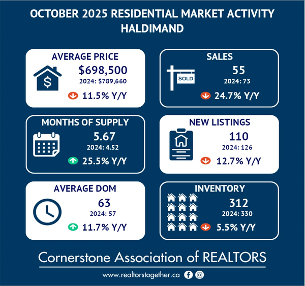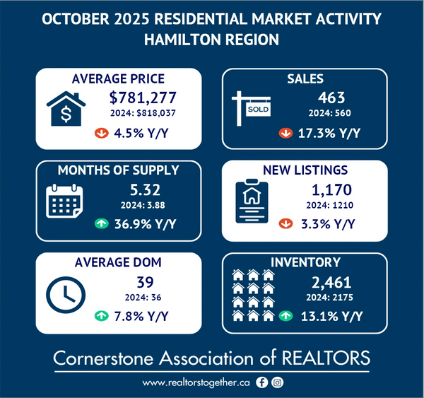 Hamilton, ON (November 5, 2025) — In October, a total of 757 of homes sold across Hamilton, Burlington, Haldimand County, and Niagara North through the Multiple Listing Service® (MLS®) System of the Cornerstone Association of REALTORS® (Cornerstone). This figure represents only 16 fewer sales than the previous month; however, it is 34 per cent below the typical levels expected for October.