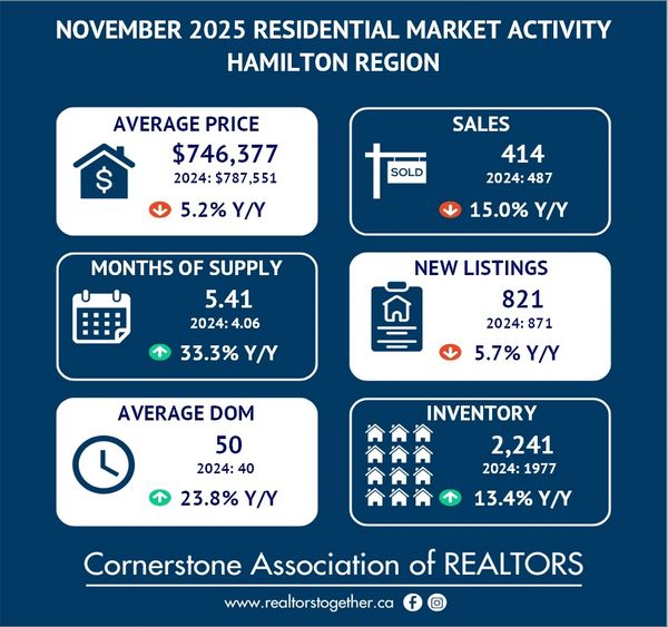 Hamilton, ON (December 3, 2025) – In November, a total of 624 homes sold across Hamilton,