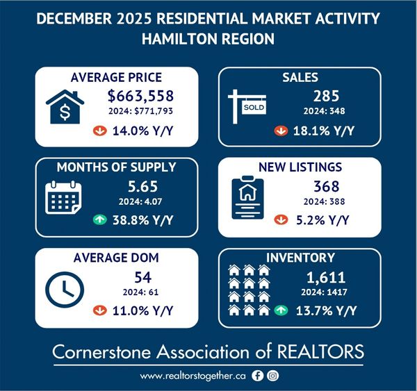 “At the end of 2025, fewer new listings came online, and with more homes staying on the market because of slower sales, buyers had more options,” says Nicolas von Bredow, Cornerstone spokesperson for the Hamilton-Burlington market area. “2025 was a year marked by global uncertainty, which affected the Canadian economy and our local real estate market, with fewer buyers entering the market due to concerns about job security and higher interest rates."